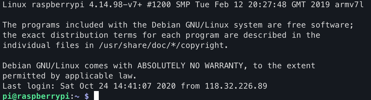 연결에 성공하면 위와 같은 메세지가 뜨고, 라즈베리파이에 접속이 됩니다 :)