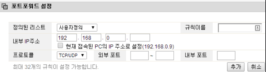 그 후 포트포워딩 메뉴는 고급설정->NAT/라우터 관리->포트포워드 설정 에 있는데 iptime 외에 다른 공유기들도 비슷한 이름으로 되어 있을 거에요!