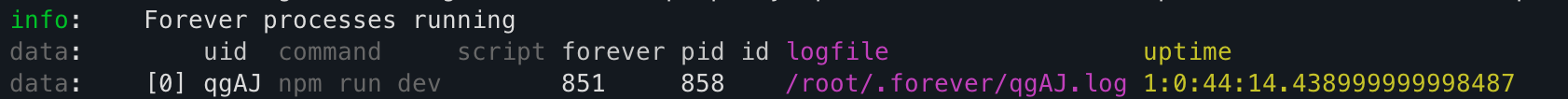 forever list위 명령어는 현재 forever 로 실행시킨 프로세스들의 리스트와 정보를 보여줍니다.