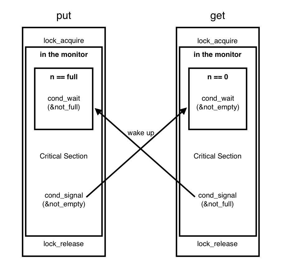처음에는 버퍼에 아무 글자도 없을 것이기 때문에 get 은 cond_wait(¬_empty) 에 의해 not_empty 가 true 가 될 때까지 대기 상태가 된다. 이와 동시에 put 함수에서는 하나의 글자를 버퍼에 쓰고 cond_signal(¬_empty) 를 하여 ¬_empty 라는 조건을 true 로 만들어주고, 이는 get 함수가 대기상태에서 깨어나 다시 진행되게 만들며 버퍼에 쓰여진 글자가 있기 때문에 정상적으로 글자를 읽어낸다. 반대의 경우도 마찬가지로 put 함수가 반복되어 버퍼가 가득 차게 되면 put 함수에서는 cond_wait(¬_full) 로 put 함수가 더 이상 실행될 수 없도록 대기 상태로 만들고 get 함수가 글자를 읽어 버퍼를 비워준 후에 cond_signal(¬_full) 을 통해 not_full 조건을 true 로 만들어 준 후에 다시 실행된다.