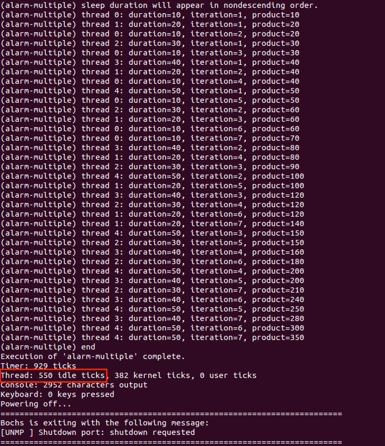 처음에 구현되어 있던 busy-waiting 방식으로 실행 시 Thread: 0 idle ticks 로 나오던 부분이 550 idle ticks 로 바뀌었다. 이것은 idle 스레드가 550 ticks 동안 실행되었다는 것이고, idle 스레드는 다른 어떤 스레드도 실행되지 않는 상태일 때 실행되는 스레드로 550 ticks 동안의 쉬는 시간이 발생했다는 뜻과 같습니다. busy-waiting 방식일 때 ready list 가 비어있는 순간이 없기 때문에 idle 스레드가 실행될 일이 없어 0 idle ticks 로 출력된 것과 달리 sleep/awake 방식에서 시스템 자원의 낭비가 줄어든 것을 볼 수 있다.