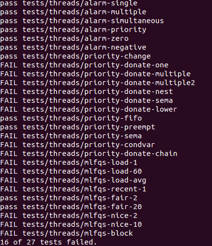 무려 4개의 테스트를 더 통과했다!! 아직 통과하지 못한 테스트를 보면 priority-donate, priority-sema 등의 항목이 눈에 띈다. pintos 도큐먼트에서도 명시되어 있듯이 priority scheduling 은 priority donate 와 priority sema 까지 구현해야 한다. 이것은 다음 포스트에서 살펴보도록 한다.