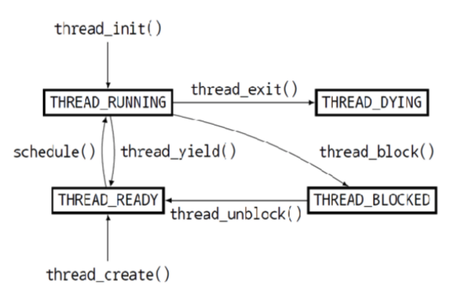 스레드의 흐름 위 그림에서 보면 THREAD_RUNNING 에서 나가는 화살표가 running thread 가 CPU 를 양보하는 순간이다. thread_exit(), thread_yield(), thread_block() 세 경우가 있는 것을 볼 수 있다. 이 세 함수들은 <thread/thread.c> 에 있고, 하나하나 살펴보면 함수의 마지막부분에 schedule() 함수를 호출하고 CPU 소유권을 내려놓는다. 그럼 이 schedule() 를 살펴보아야 한다.