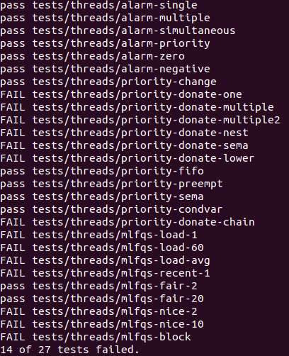 2개의 테스트를 더 통과한 것을 볼 수 있다. 방금 우리가 구현한 priority-sema, priority-condvar 가 pass 가 나왔다. FAIL 의 숫자가 빠르게 줄어가는 것이 보기 좋다. 다음 시간에는 priority-donate 문제를 풀어보도록 한다.